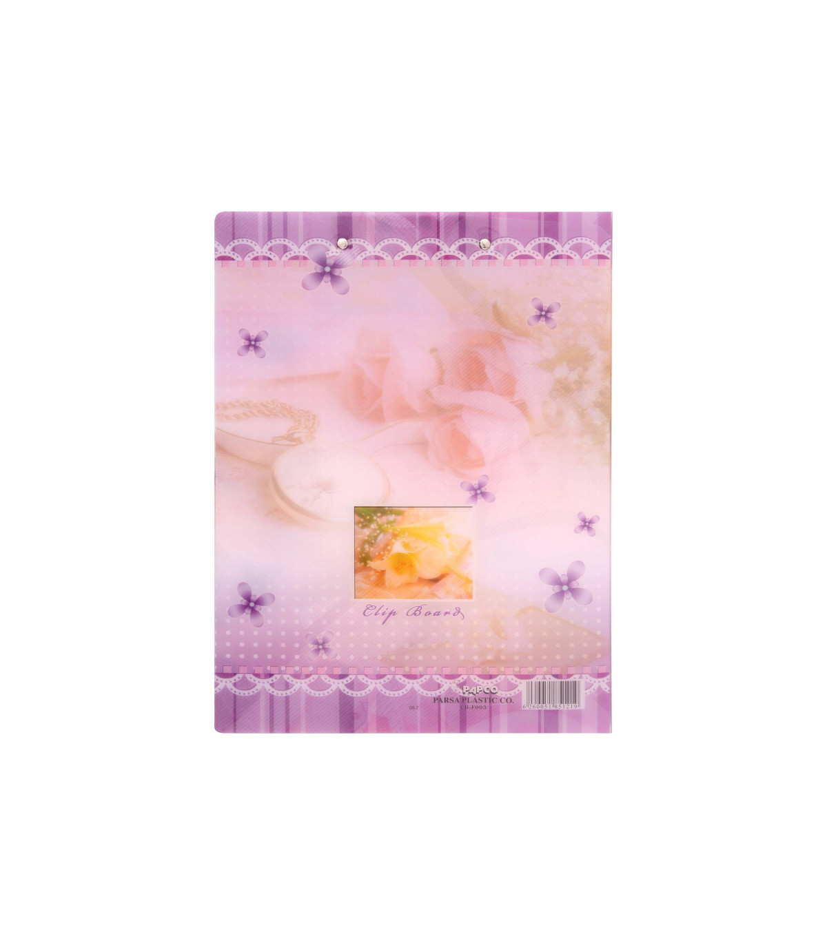 جنس آن نیز از پلاستیک راه راه بوده و به صورت کلاسوری باز می شود. در سمت راست این محصول علاوه بر گیره فلزی نگهدارنده کاغذ، یک جیب که روی آن دو محفظه برای قرارگیری خودکار و کارت ویزیت تعبیه شده است، قرار دارد.