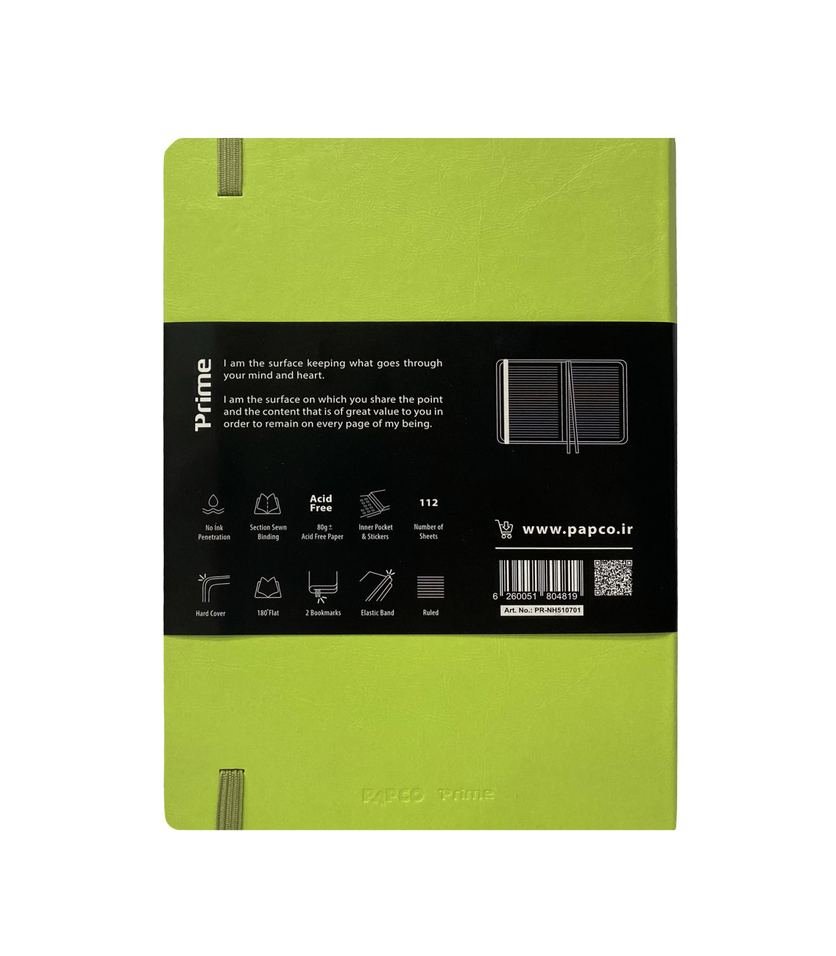 دفتر پرایم، یک خط بوده که فاصله بین خطوط آن 7 میلی متر و در واقع نزدیک به هم هستند. علاوه بر اینکه 112 برگ است، فضای زیادی برای نوشتن و در هر صفحه 27 خط دارد. در صفحه اول آن می توانید نام و اطلاعات تماس خود را برای جلوگیری از گم شدن دفتر بنویسید. در انتهای این دفتر یک جیب کاغذی نگهدارنده برای قرار دادن برگه های شما تعبیه شده است که حاوی یک برگ برچسب می باشد. جنس جلد این دفتر مقوایی و به قدری سخت و محکم است که به هیچ عنوان پاره نمی شود و تا چندین سال می توانید از آن استفاده کنید. و پس از بسته شدن با یک کش محفوظ می شود. همچنین دارای 2 ربان نشانک جهت نشان کردن صفحات مورد نظر شما است.