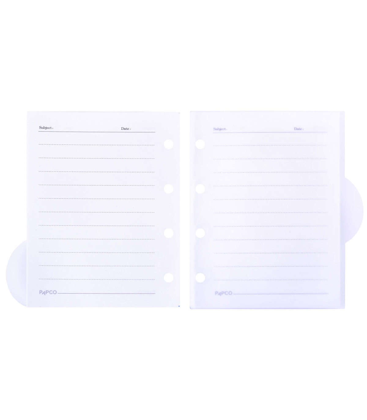 اوراق دفتر یادداشت B8 قفل دار شامل 4 پانچ و سه دیوایدر (جدا کننده ) بدون رنگ برای تفکیک و دسته بندی بر اساس موضوعی مطالب است. این اوراق یک خط و 60 برگ هستند که در ابعاد 6/7 × 8.5 سانتی متر تولید و عرضه می گردد.