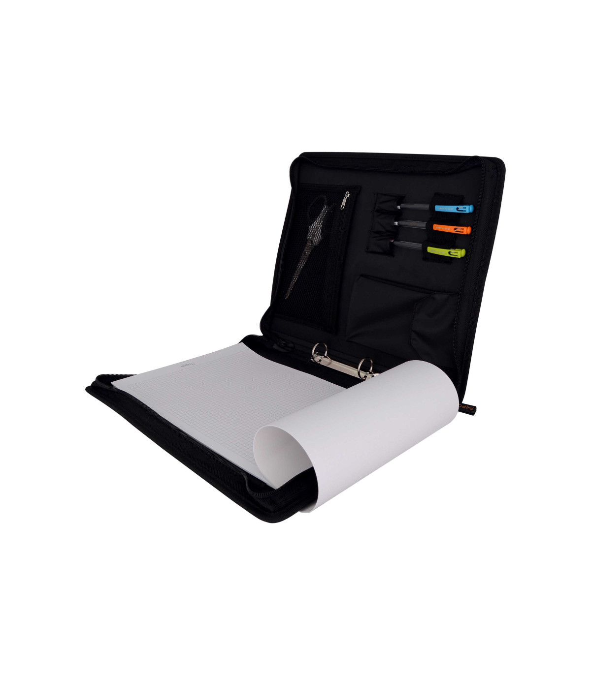 در سمت راست این کیف که به صورت 180 درجه باز می شود، دو جیب به ابعاد 22 × 29.5 سانتی متر و 220 × 24.1 سانتی متر و تعدادی کاغذ یادداشت و در سمت چپ آن نیز یک جیب توری به ابعاد 18.5 × 11.2 سانتی متر که با زیپ بسته می شود، یک محفظه به ابعاد 8.5 × 13.5 سانتی متر، مناسب برای قرار دادن تلفن همراه و یا ماشین حساب، که درب آن به وسیله چسب بسته می شود و سه محفظه و کش به منظور نگهداری خودکار و یا سایر لوازم التحریر و نوشت افزار تعبیه شده است. در قسمت میانی نیز دارای دو حلقه برای نگهداری حدود 100 تا 150 عدد اوراق کلاسور می باشد.