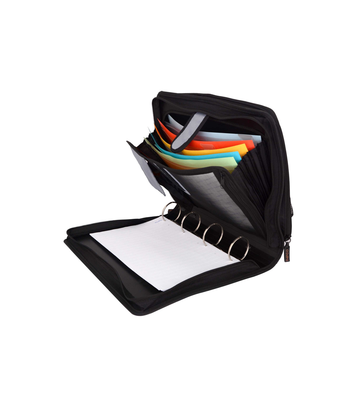 در سمت راست این کیف که به صورت 180 درجه باز می شود، یک جیب توری بزرگ به ابعاد 30.5 × 22.5 سانتی متر که با زیپ بسته می شود، یک جیب پارچه ای 14.8 × 8 سانتی متر که به درب آن با چسب بسته می شود و در پشت این جیب ها شش محفظه (اکسپندینگ فایل) که از داخل با یک پوشش چسب دار و از بیرون کیف به منظور دسترسی راحت تر به فایل ها با زیپ باز می شود و در سمت چپ آن نیز یک کلاسور 4 حلقه با ظرفیت نگهداری حدود 400 عدد اوراق کلاسور قرار دارد.