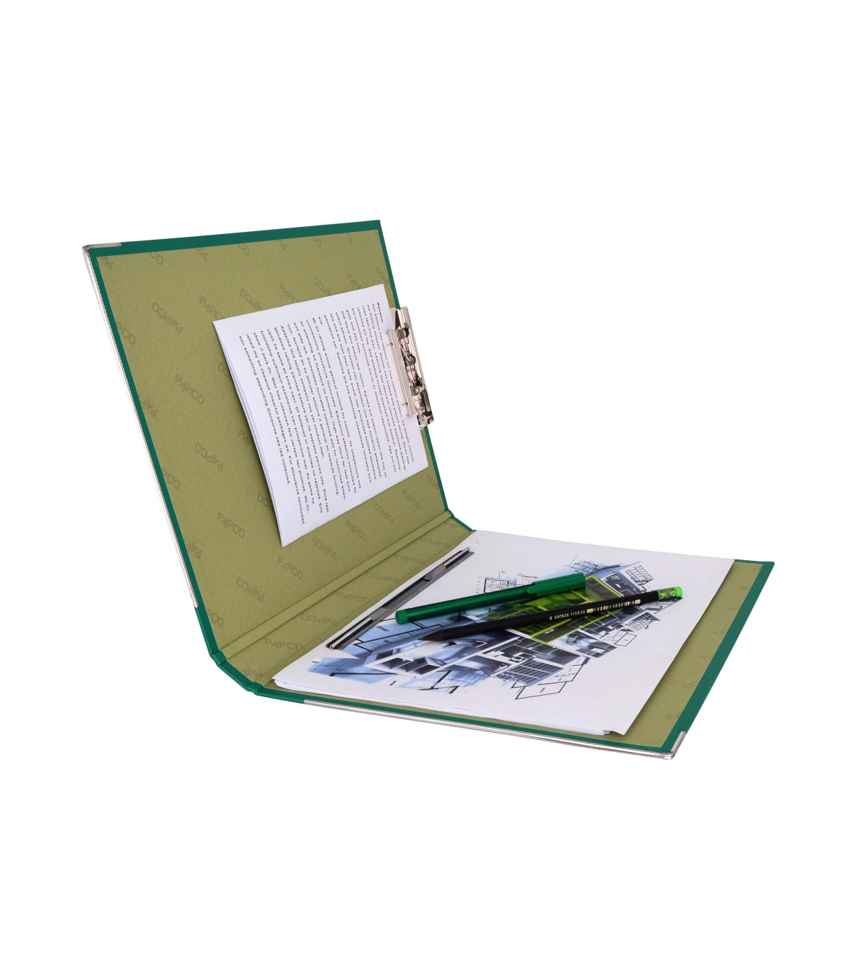 پوشه دو منظوره مقوایی پاپکو یک گیره فنری به صورت عمودی دارد که برگه هایی که پانچ شده اند را نگهداری می کند و دارای یک گیره نگهدارنده فلزی به صورت افقی است که به عنوان زیردستی برای راحتی حین نوشتن نیز کاربرد دارد .