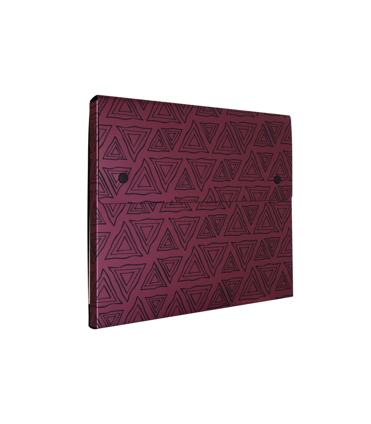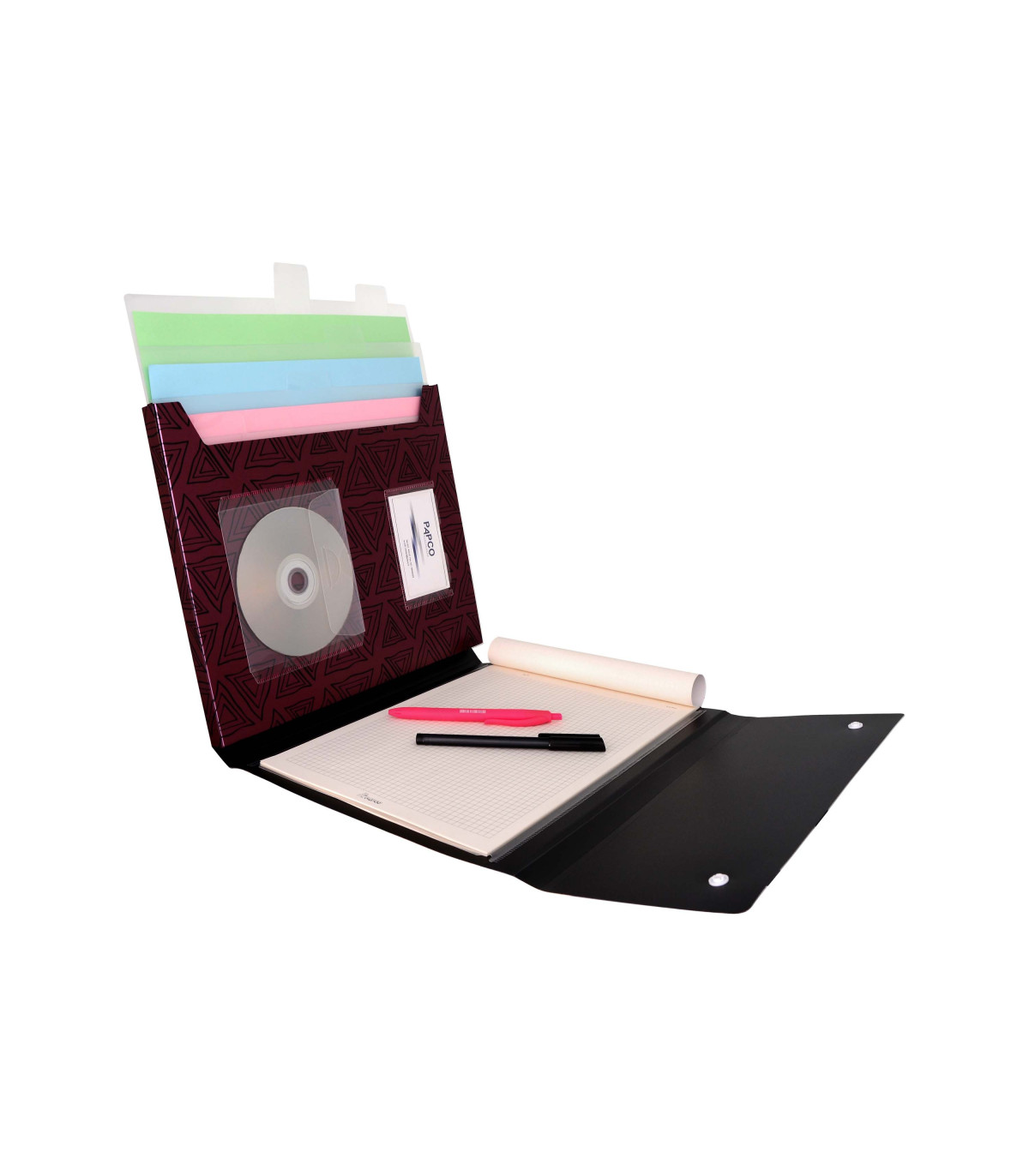 این پوشه در طرح های زیبا و رنگ های سرمه ای، نقره ای، یشمی و زرشکی موجود است. از ویژگی های این محصول می توان 20 الی 25 برگه یک خط برای یادداشت، 6 فایل (خانه) برای قرار دادن برگه های سایز (FC (33 × 20.3 CM، جای لوح فشرده و یک جیب برای کارت ویزیت را نام برد.