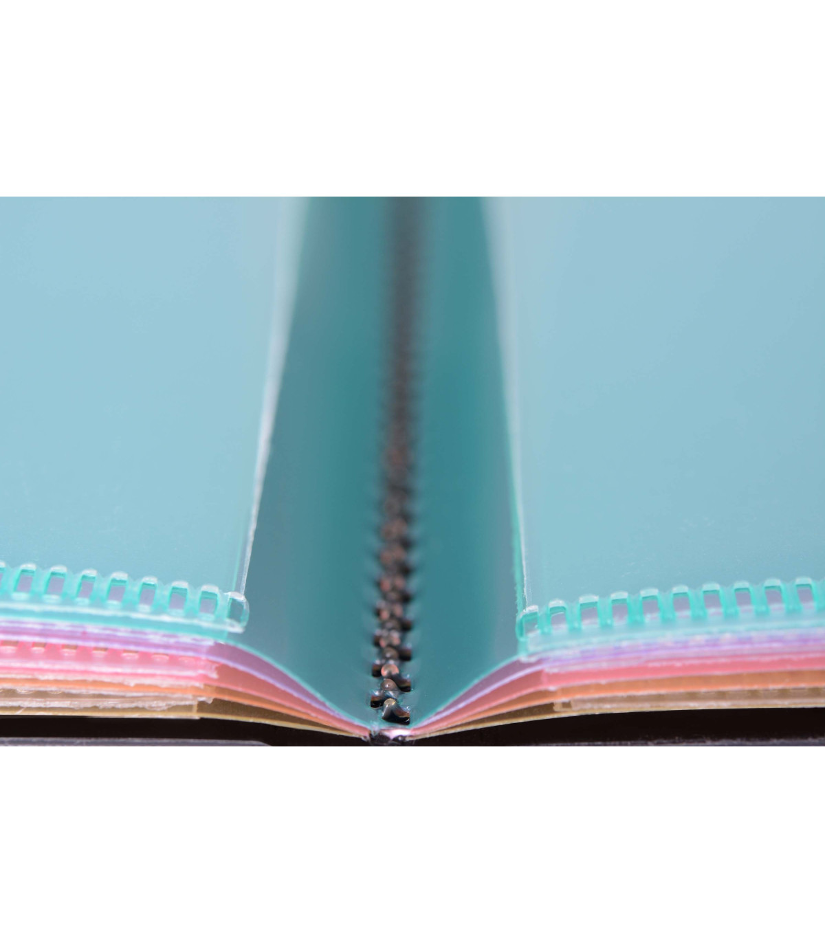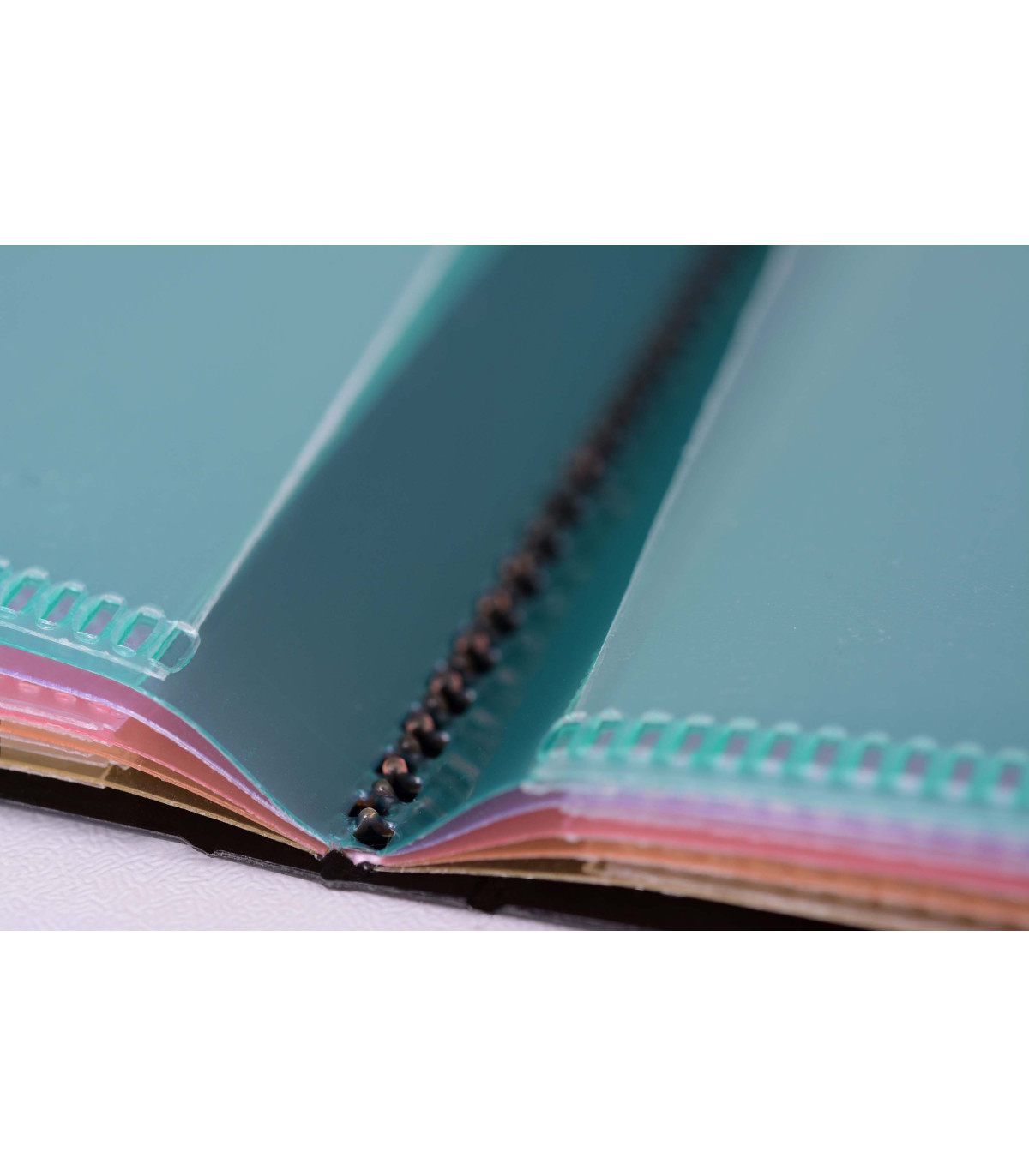 در این پوشه به دلیل عطف 1.5 سانتی متری حداکثر 100 برگه به سایز A4 ظرفیت دارد. اگر از این تعداد کاغذهای بیشتری جای دهید پوشه فرم درست خود را از دست می دهد. با کش بسته می شود و صحافی آن به صورت دوخت بوده که نمی توان به آن صفحه اضافه و یا از آن کم کرد.