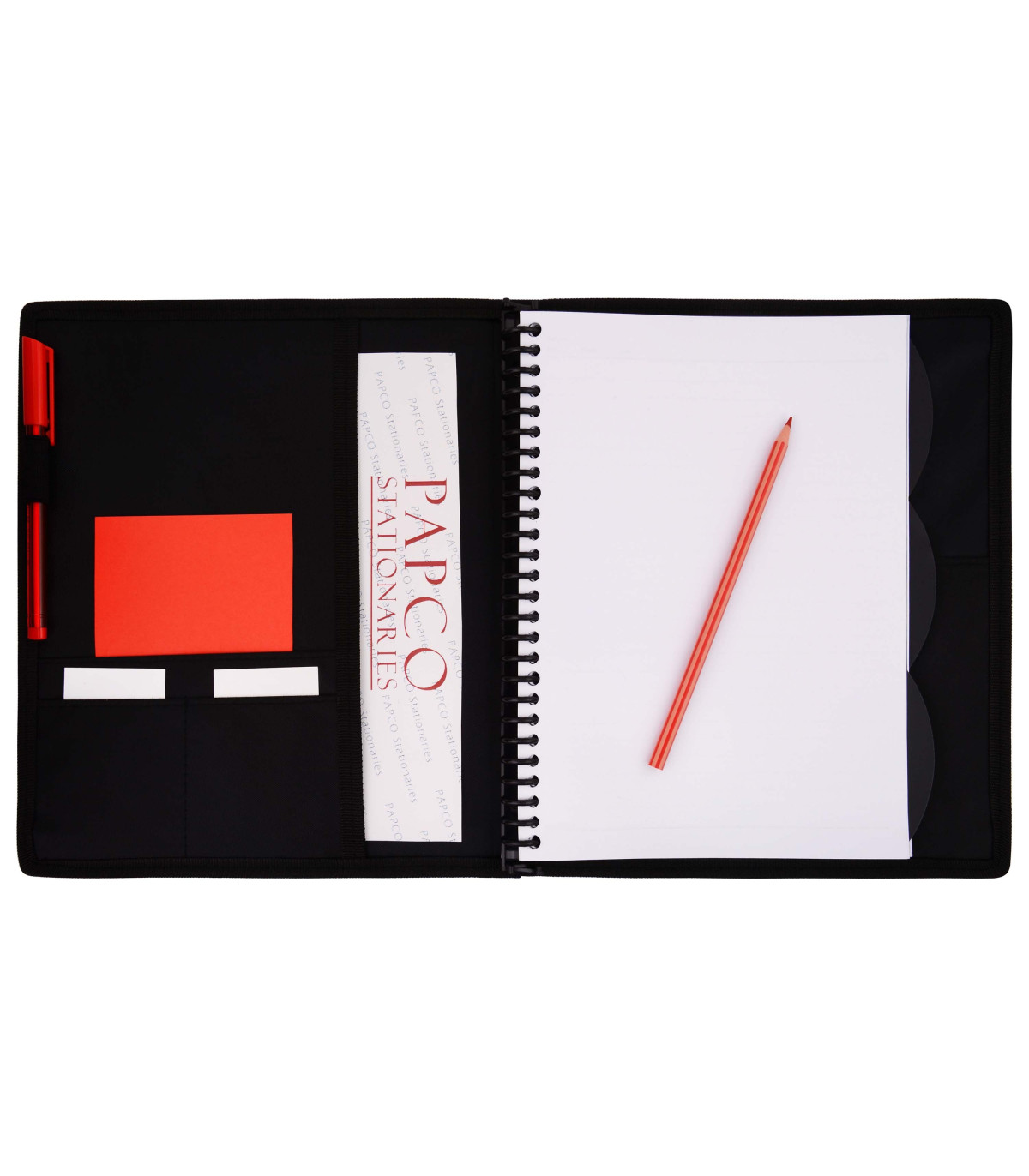 جلد این دفتر از جنس پلاستیک مات با آج لانه زنبوری داشته و صحافی آن به صورت کلاسوری با قفلی از جنس پلاستیک مرغوب بوده که سبب نگهداری هرچه بهتر کاغذها می شود. برگه های این دفتر نیز به وسیله 3 دیوایدر یا جداکننده موجود در آن تقسیم و تفکیک شده و می توان به راحتی نوشته ها را بر حسب موضوع دسته بندی کرد.